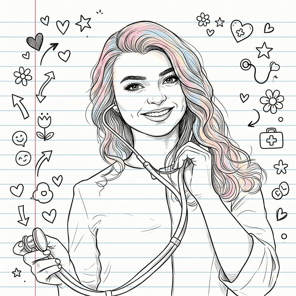 Use the uploaded photo of the person as the subject. Keep the same face, identity, and facial features. Transform the image into a hand-drawn sketch on a ruled notebook paper background. Create clean black ink line art with detailed facial features and expressive eyes. Add colorful highlights (pastel rainbow tones) in the hair for a soft artistic effect. Surround the portrait with playful doodles like hearts, stars, flowers, arrows, and small cute icons along the margins. Include notebook lines and a red vertical margin line for realism. Style should feel like a creative student sketchbook page, minimal shading, smooth linework, aesthetic, trendy, high detail, 8k resolution.